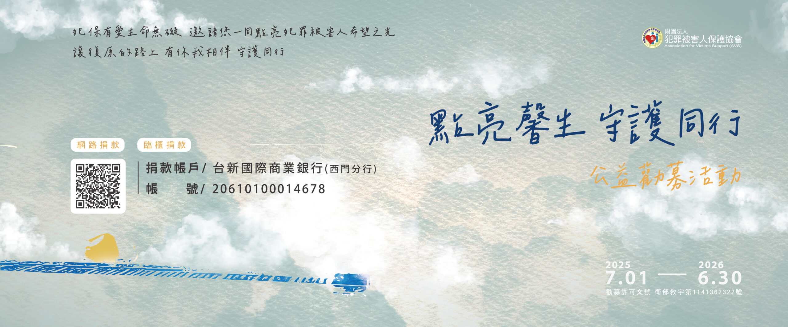 銀行帳號|台新國際商業銀行 西門分行(通匯代碼812-0610)|戶名 財團法人犯罪被害人保護協會|帳號 2061-01-0001139-4|索取收據說明 ![]()